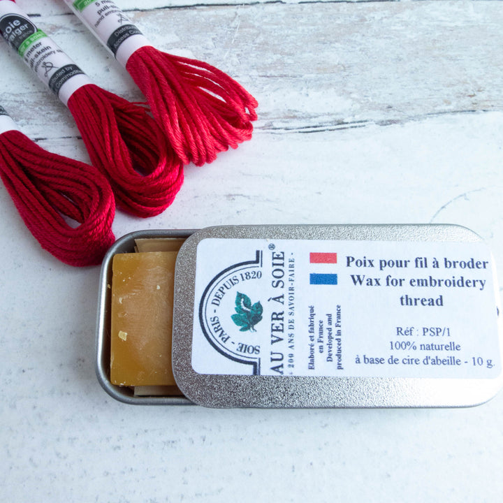 Au Ver a Soie Silk Thread Conditioner is made from a homemade recipe that has been handed down through the generations of the Au Ver a Soie family. Made with 100% natural ingredients, this thread wax is compatible with silk thread and will not alter the color of the thread. It will make your silk thread waterproof and help it keep the natural twist of the thread in place better. Coating your thread with this wax also improves the the tightness of finishing knots minimizing the chances of unravelling.
