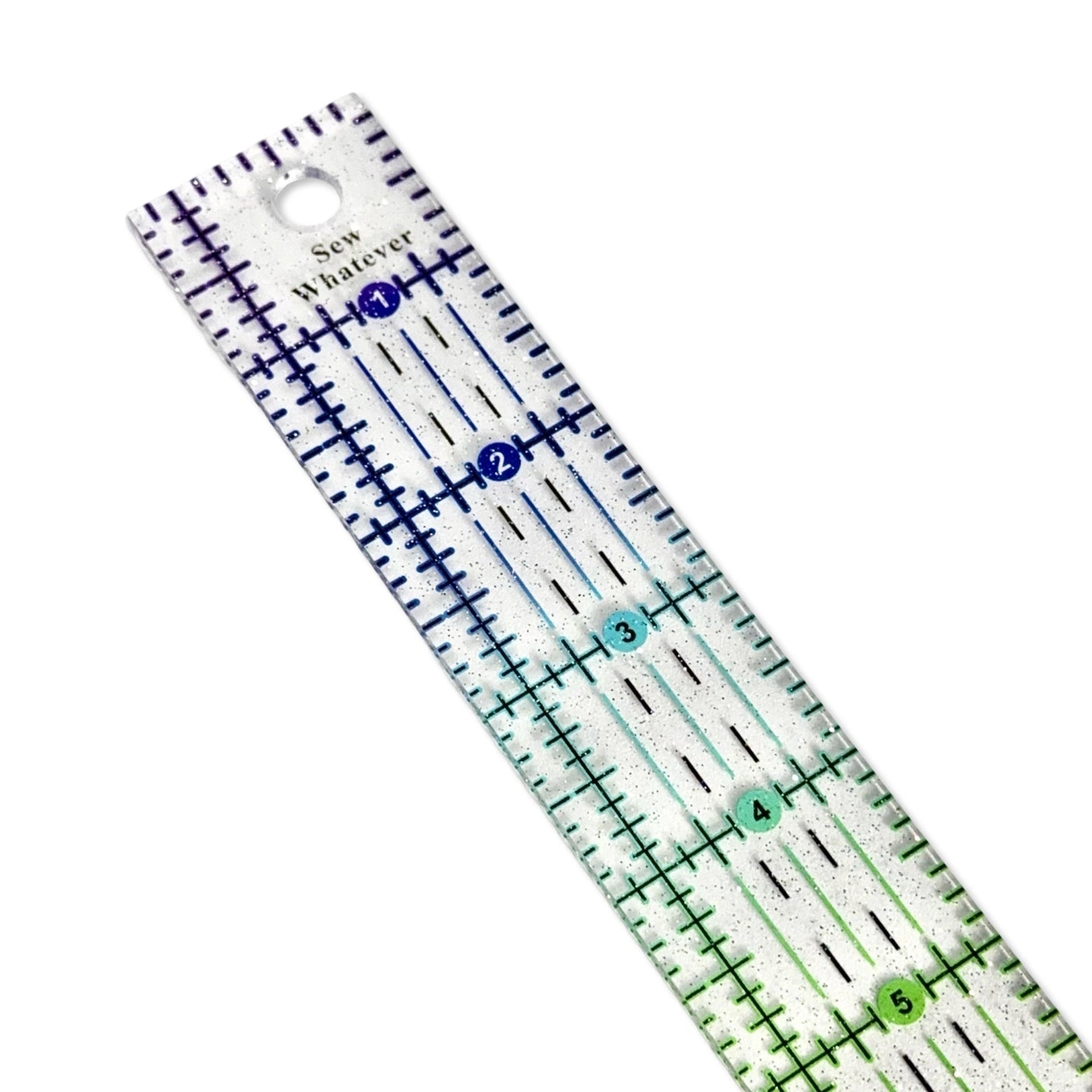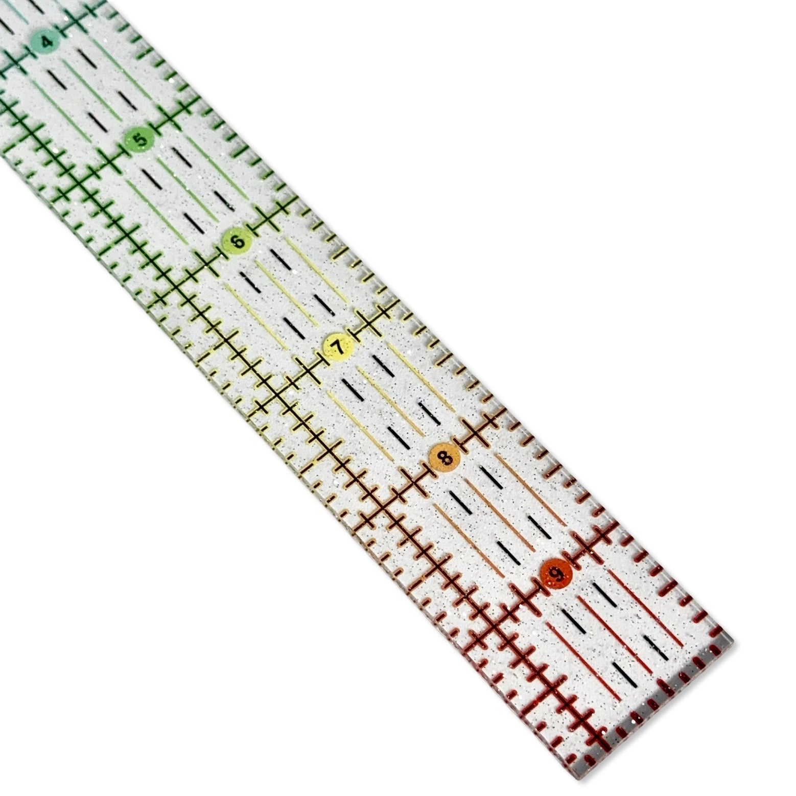 Precision meets sparkle with this 10" x 1.25" quilting ruler, featuring a mesmerizing rainbow gradient glitter finish. The clear acrylic construction delivers accurate measurements for piecing, rotary cutting, and appliqué work, while the embedded glitter adds visual appeal to your sewing space. Perfect for quilters who refuse to compromise between functionality and style.