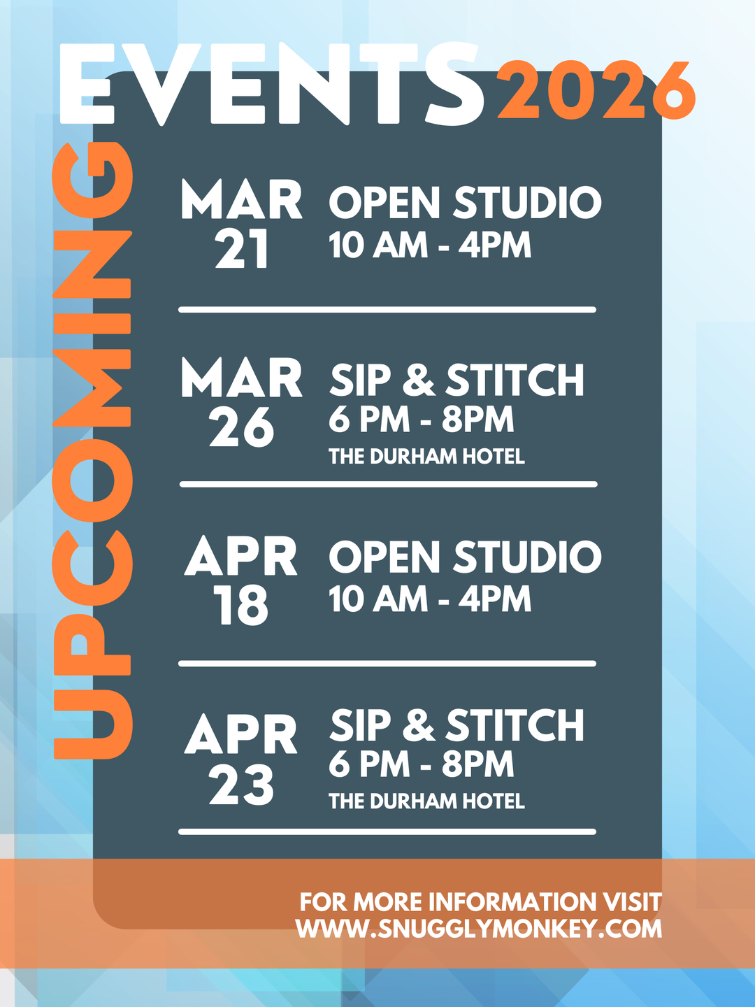 Join our community of local stitchers and crafters at our monthly Sip & Stitch get togethers at the Durham Hotel in downtown Durham. Bring your current project and come stitch with us! These gatherings are free and open to the public.