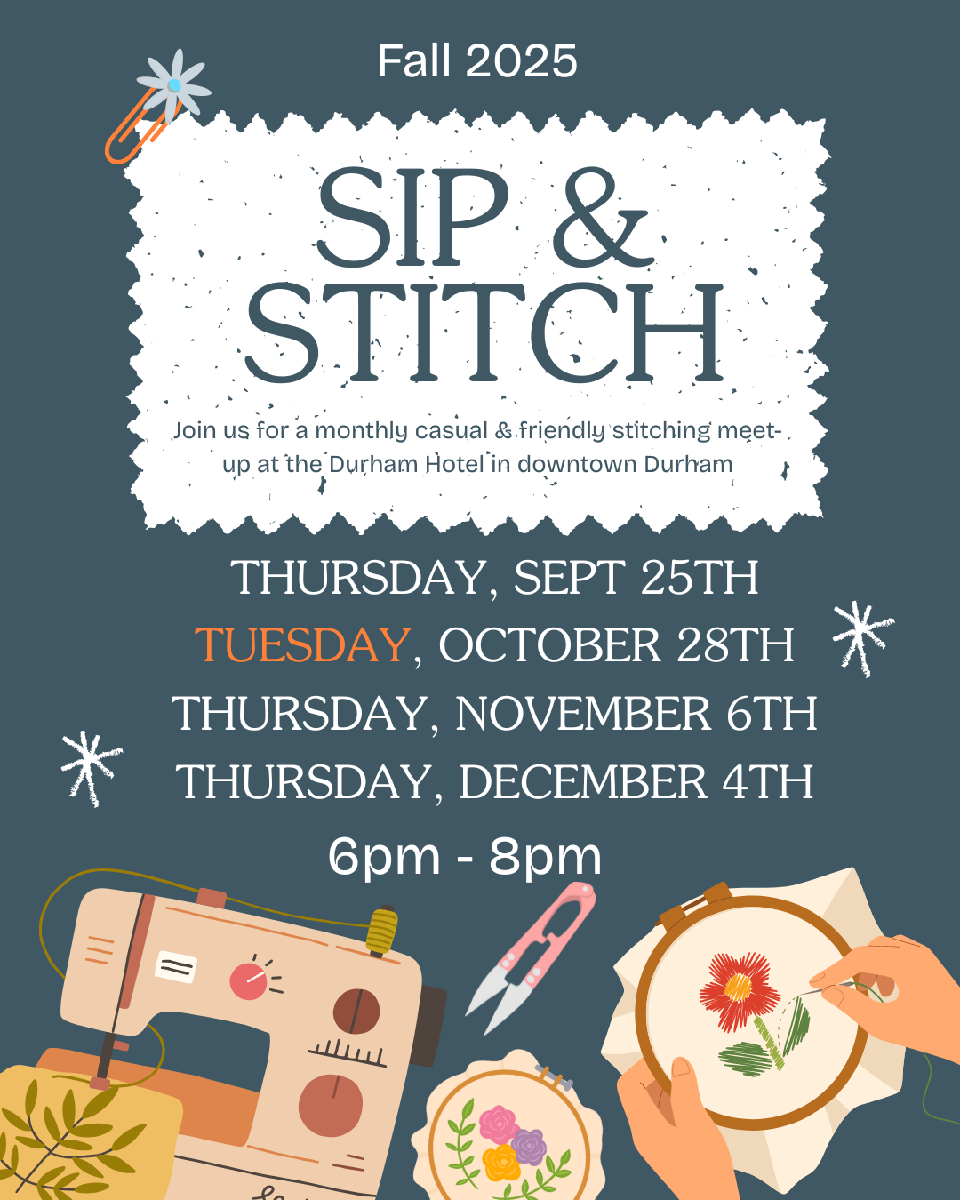 Join our community of local stitchers and crafters at our monthly Sip & Stitch get togethers at the Durham Hotel in downtown Durham. Bring your current project and come stitch with us! These gatherings are free and open to the public.